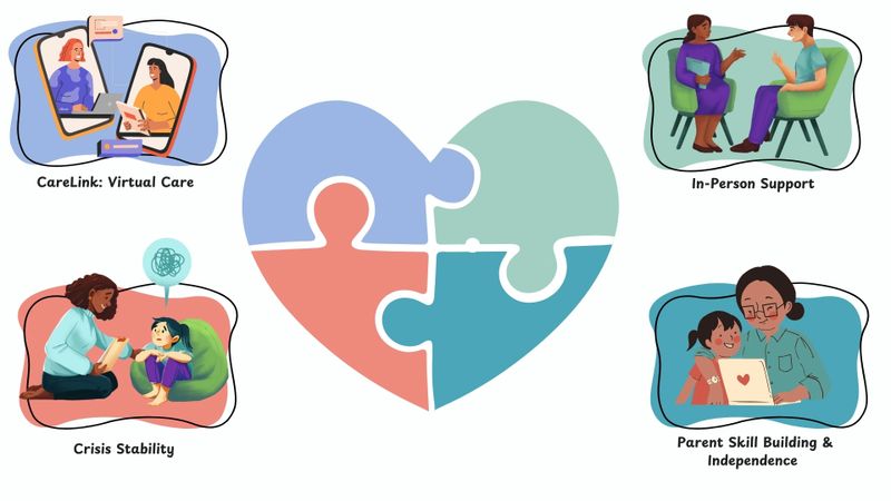 Our In-Home Support model is built around four connected areas of care: CareLink virtual support, in-person support, crisis stability, and parent skill building and independence. Together, these service components help create a more responsive, coordinated, and meaningful support system for youth and families navigating complex needs.